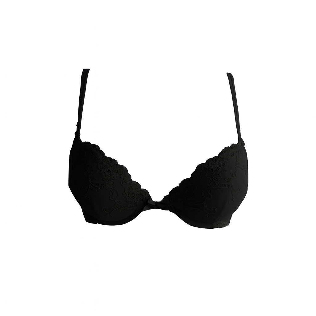 Zwarte push-up bh met Swarovski-details en uitneembare olie pads. Comfort, stijl en Italiaanse elegantie – handgemaakt in Italië. Beperkt leverbaar.