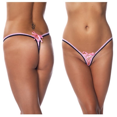 Sexy roze / zwarte g-string met een schattig strikje. 100% nylon. One size fits most.