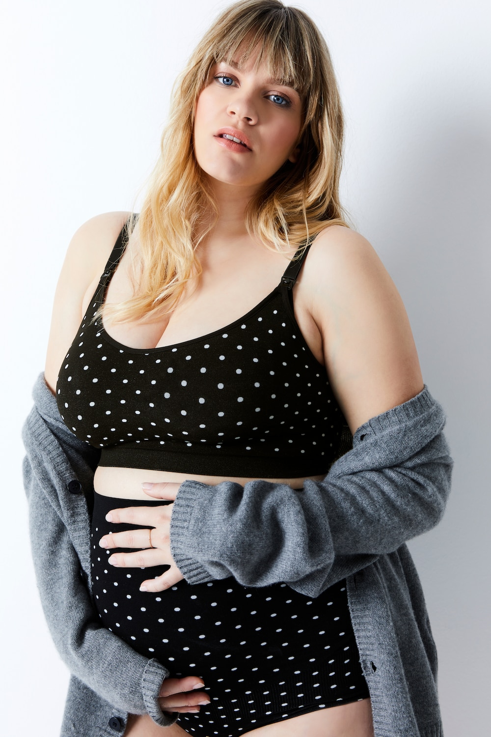 Voedingsbeha met stippen. Seamless – hoogwaardige afwerking zonder storende naden. Cups bovenaan met kliksluiting te openen. Aangename, verstevigde zijkanten, elastische en verstebare bandjes. OEKO-TEX. Bellieva is de eerste lichaamssensibele collectie, die niet alleen zwangere vrouwen en moeders helpt, maar alle vrouwen kleding biedt die soms problemen hebben met hun buik – om welke reden dan ook. Door superzachte en flexibele materialen, praktische ideeën, zoals bijzonder brede stretchboorden of smarte oplossingen die de kleding laat meegroeien, is Bellieva het nieuwe merk voor iedereen die zijn lichaam aan bijzondere uitdagingen blootstelt.