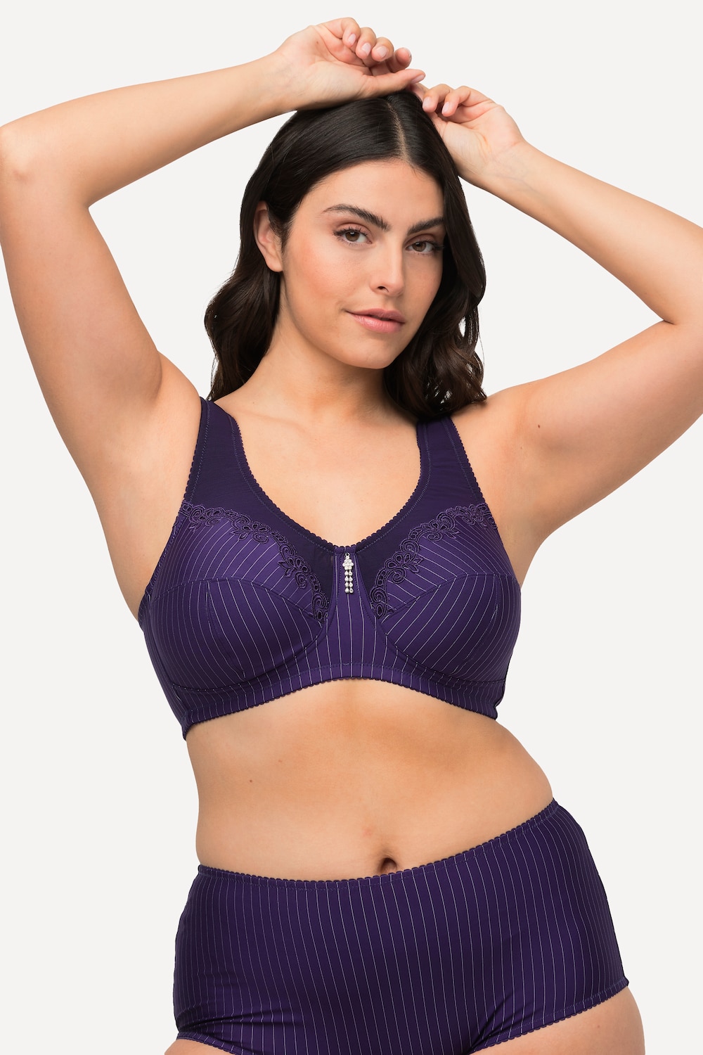 Deze comfortbeha met klassiek krijtstreepdessin geeft veilige steun voor grote maten en is daardoor een betrouwbare partner. De extra brede, gepolsterde, in lengte verstelbare bandjes en het hogere rugdeel voorkomen het snijden in de huid. Daardoor zit de beha aangenaam en beschermt zo de rug en schouders. De band onder de buste, de ingewerkte inzetten van netstof opzij en onder de bandjes zorgen voor goede steun en passen zich optimaal aan het lichaam aan. Een extra sikkelvormige inzet in de cup ondersteunt en pusht licht de buste.