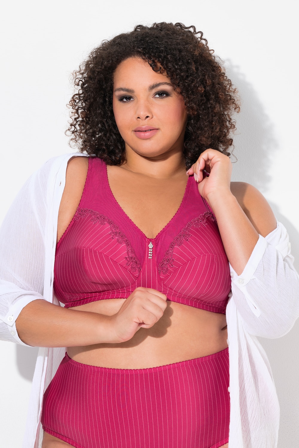 Deze comfortbeha met klassiek krijtstreepdessin geeft veilige steun voor grote maten en is daardoor een betrouwbare partner. De extra brede, gepolsterde, in lengte verstelbare bandjes en het hogere rugdeel voorkomen het snijden in de huid. Daardoor zit de beha aangenaam en beschermt zo de rug en schouders. De band onder de buste, de ingewerkte inzetten van netstof opzij en onder de bandjes zorgen voor goede steun en passen zich optimaal aan het lichaam aan. Een extra sikkelvormige inzet in de cup ondersteunt en pusht licht de buste.
