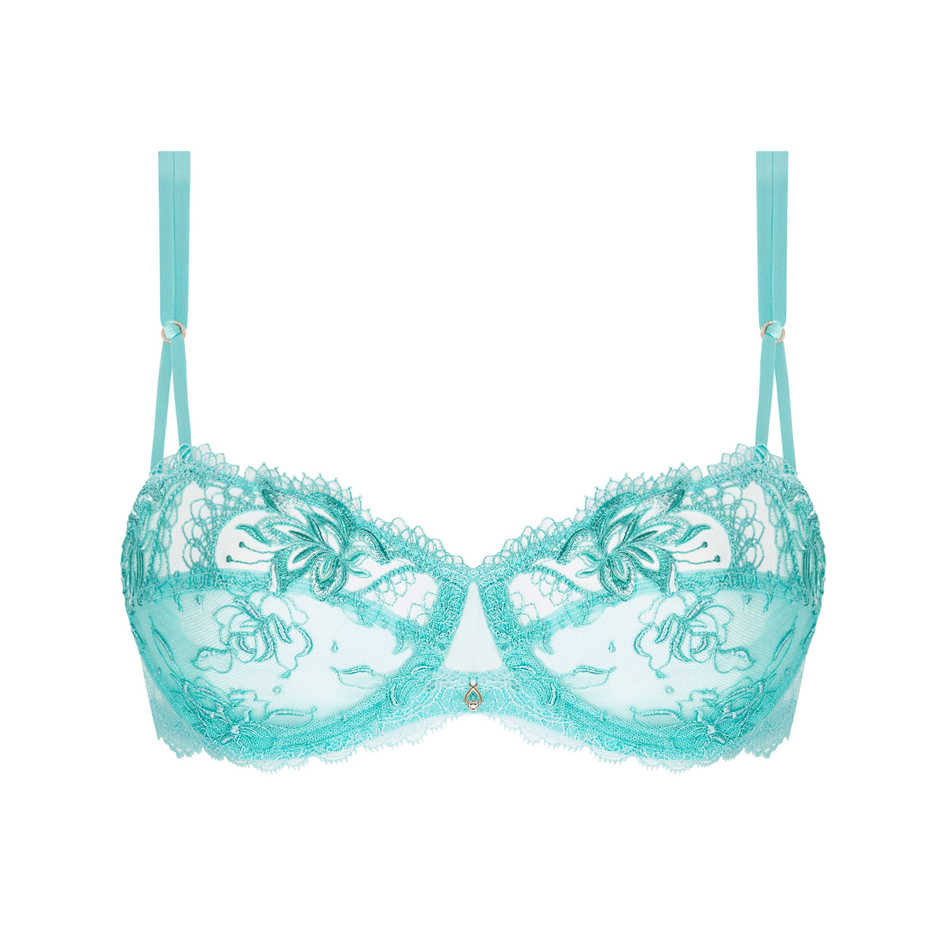Verfijnde BH met horizontale snit, broderie en goudkleurige details. Creëert een natuurlijk en vrouwelijk decolleté met stijlvolle afwerking.