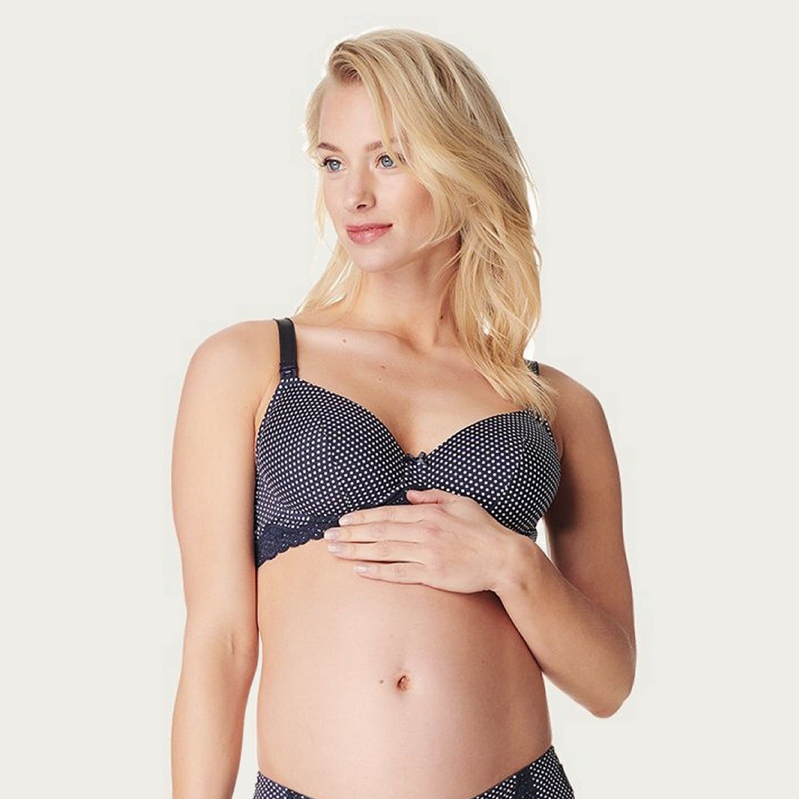 Mooie blauwe voorgevormde voedingsbh met vrolijke witte stippen. De voedingsbh heeft handige clips aan de voorkant wat het voeden een stuk makkelijker maakt.