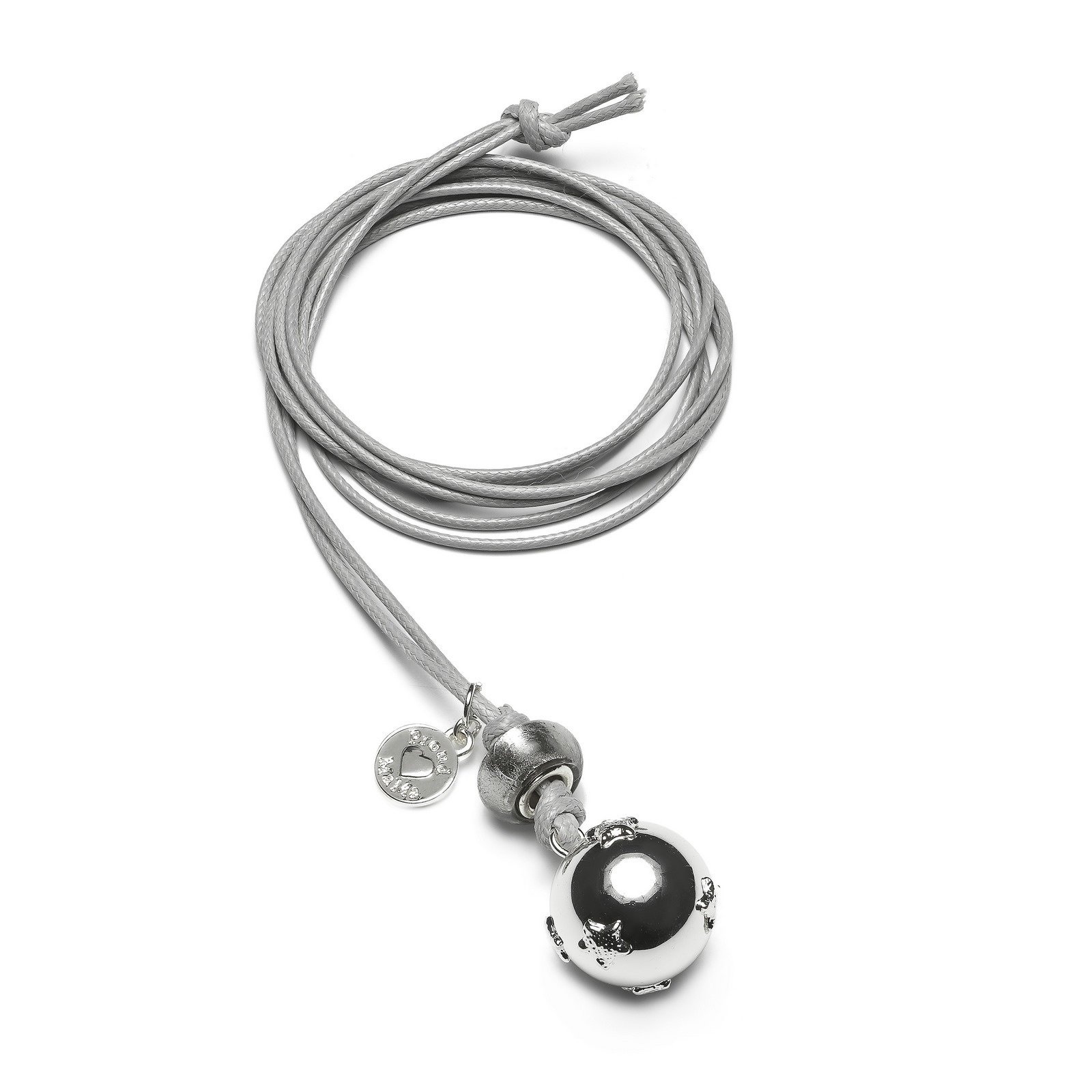 Ballchain Babybel Ketting Basic Stars ie een lange zilver grijs touwtje met een zilverkleurige Bola aan de onderkant. en een mooi Proud mama bedel. De bal maakt een aangenaam geluid voor de baby,