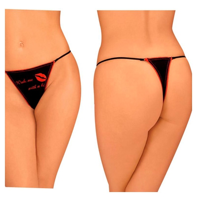Stoute zwarte string met de tekst “Wake me with a kiss”.