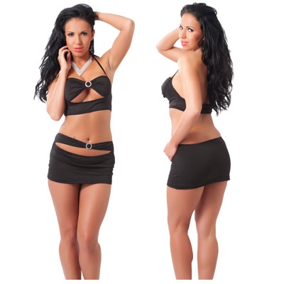 Gewaagd zwart topje met bijpassend mini rokje dat op een feestje zeker niet zal misstaan. 90% polyester, 10% elastane. One size fits most.