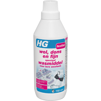 HG wol, dons & fijn speciaal wasmiddel voor tere weefsels maakt dekbedden, jacks, slaapzakken, lingerie en babykleding van wol, dons, zijde, lycra, katoen, linnen en andere stoffen veilig en stralend schoon. Was na was houdt het product de fijnste kleding en het gevoeligste textiel mooi, zacht en in vorm. Het product is geschikt voor zowel hand als machinewas op alle temperaturen. Goed voor ongeveer 10 wasmachinebeurten of 21 handwasbeurten.De dop van HG wol, dons & fijn speciaal wasmiddel voor tere weefsels is te gebruiken als maatbeker. Vul deze maatbeker tot maatring 35 ml en voeg dit toe aan het hoofdwasmiddelbakje. Het product is ook geschikt voor de handwas. Vul hiervoor de dop tot maatring van 35 ml en los de inhoud op in ongeveer vijf liter water. Laat vervolgens het wasgoed minimaal twee uur inweken. Spoel het daarna goed uit met schoon water, voorzichtig uitknijpen of kort centrifugeren.